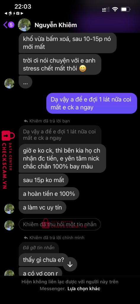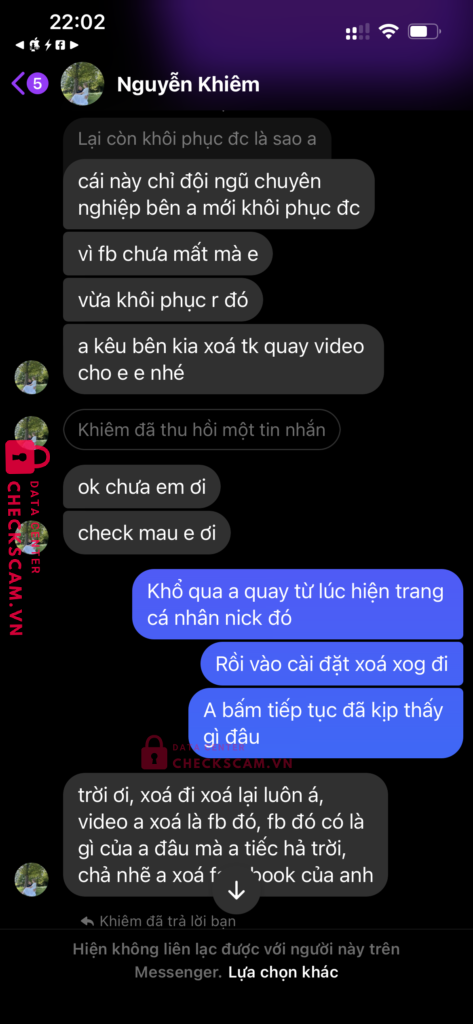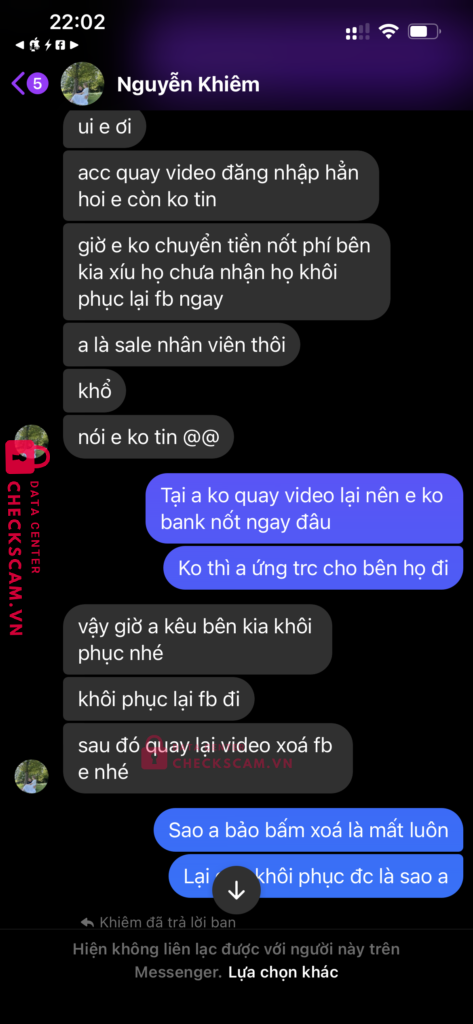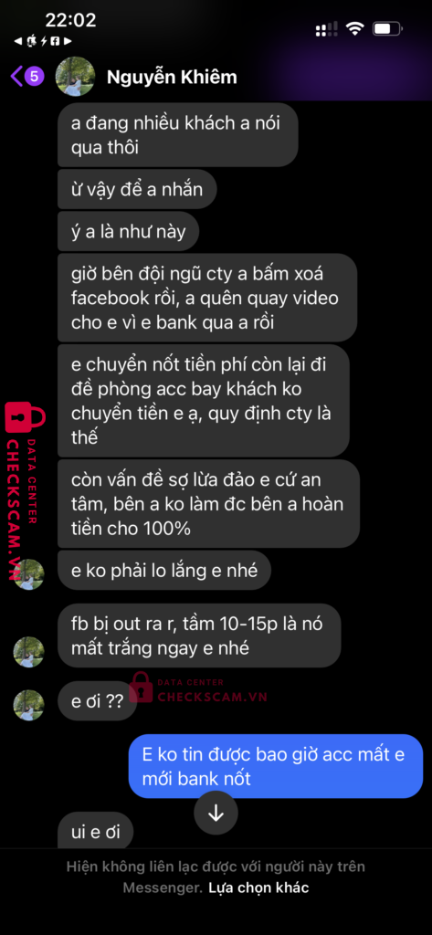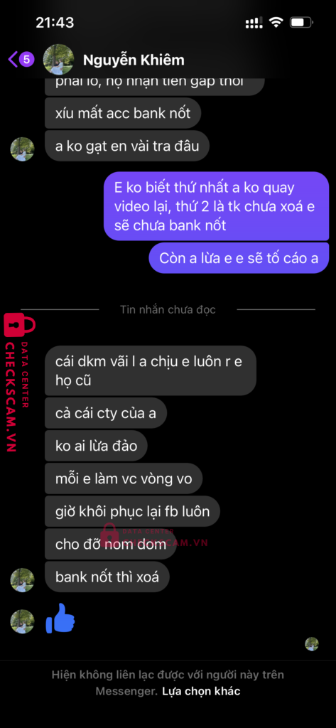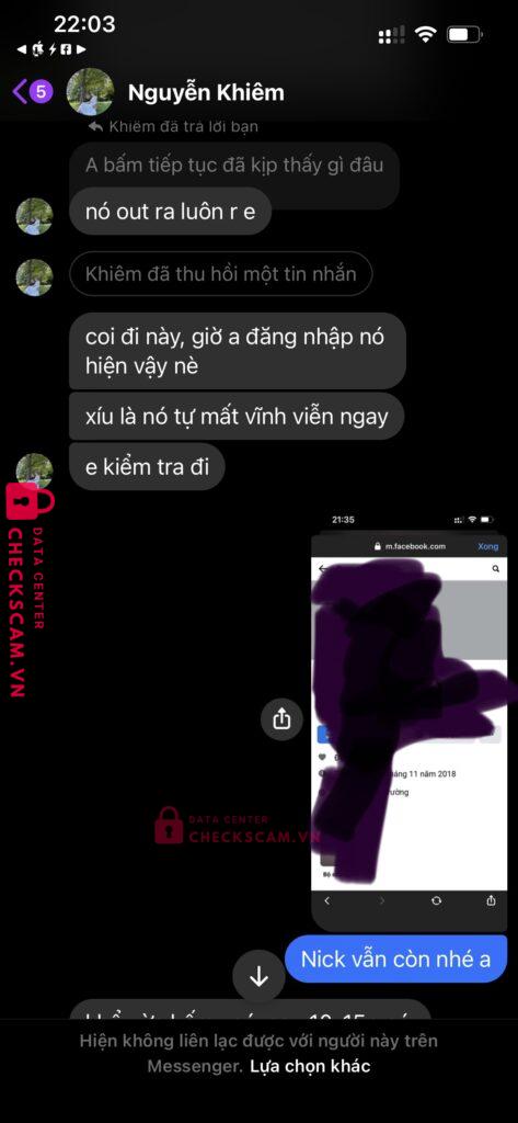 Mình nhờ thằng Nguyễn Khiêm trong nhóm Dịch vụ Facebook để rip nick người khác, nó báo giá rip là 490k, xong nó chụp ảnh với quay video vào được nick cần rip, xong nó bảo chuyển trước 1 nửa xong nó bấm xoá vĩnh viêcn tk luôn rồi chuyển nốt, mình đã tin tưởng và bank nó trước 250k xong yêu cầu nó phải quay lại video lúc vào được nick đó rồi bâdm xoá vĩnh viễn mới chuyển nốt nửa còn lại, nhưng sau khi nó nhận 250k nó vòng vo bảo quên không quay video lại, lúc này mình đã nghi kiểu này bị lừa rồi, xong cứ dục báo chuyển nốt không nó khôi phục lại tài khoản, nó bảo xoá rồi phải đợi 10-15p tài khoản mới mất, mình bảo là vậy thì đợi sau khi mình kiểm tra đúng tk cần rip ko xuất hiện trên fb nữa sẽ thanh toán nốt tiền, nó cứ dục kêu loạn nên rồi khoe cả cccd lên bảo có vợ con rồi các kiểu không lừa đâu, mình nhất quyết bato nick xoá thành công mới bank nốt, xong nó chửi mình rồi nó gỡ tin nhắn đã gửi, ẩn hết thông tin trên Facebook xong chặn mình luôn, nick cần rip cũng không bị xoá và mình mất 250k. Do giới hạn không gửi quá được 10 ảnh, nên mình chỉ gửi đc đợn chat cuối cùng. Nếu admin cần thêm thông tin xác minh nữa mình sẽ gửi thêm ảnh bằng chứng quá Zalo cho admin xác thực thêm. Mong admin đọc hết giúp và duyệt bài giúp mình ạ. Để cho ae tránh bị nó lừa nữa.