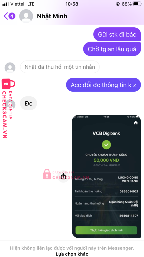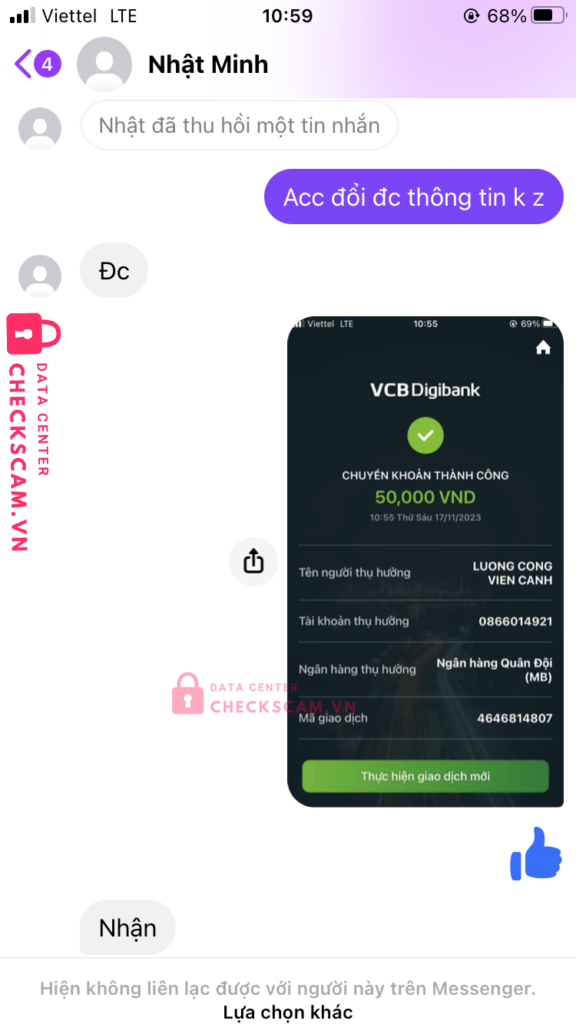 Scammer Alert: LUONG CONG VIEN CANH Reported: November 16, 2024 Scammer Information Full Name: LUONG CONG VIEN CANH Payment Gate: MB Bank Payment Account: 0866014921 Category: Marketplace scams Source: Checkscam Evidence Files Report Description Mình có mua của nó con acc game 50k và đã ck đủ cho nó xong nó chặn mình Comments Your comment Add Comment No comments yet. Be the first to share your experience with this scammer.