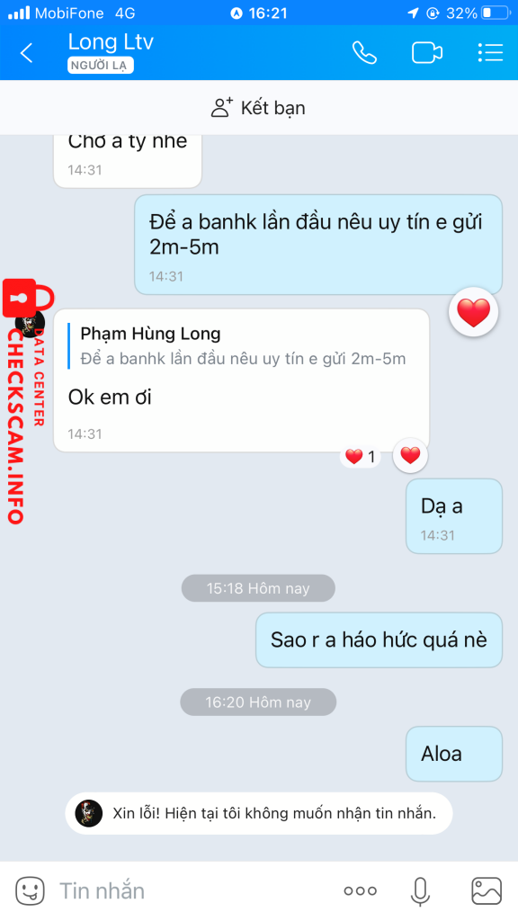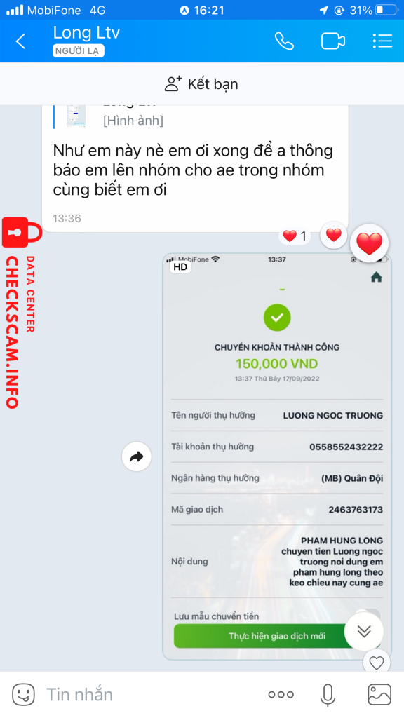 Scammer Alert: Luong Ngoc Truong Reported: November 16, 2024 Scammer Information Full Name: Luong Ngoc Truong Payment Gate: Mbbanhk Payment Account: 0558552432222 Category: Marketplace scams Source: Checkscam Evidence Files Report Description Lừa đảo cờ bạc Comments Your comment Add Comment No comments yet. Be the first to share your experience with this scammer.