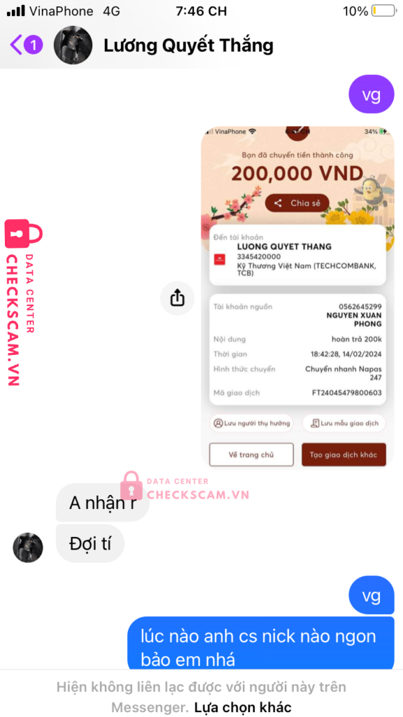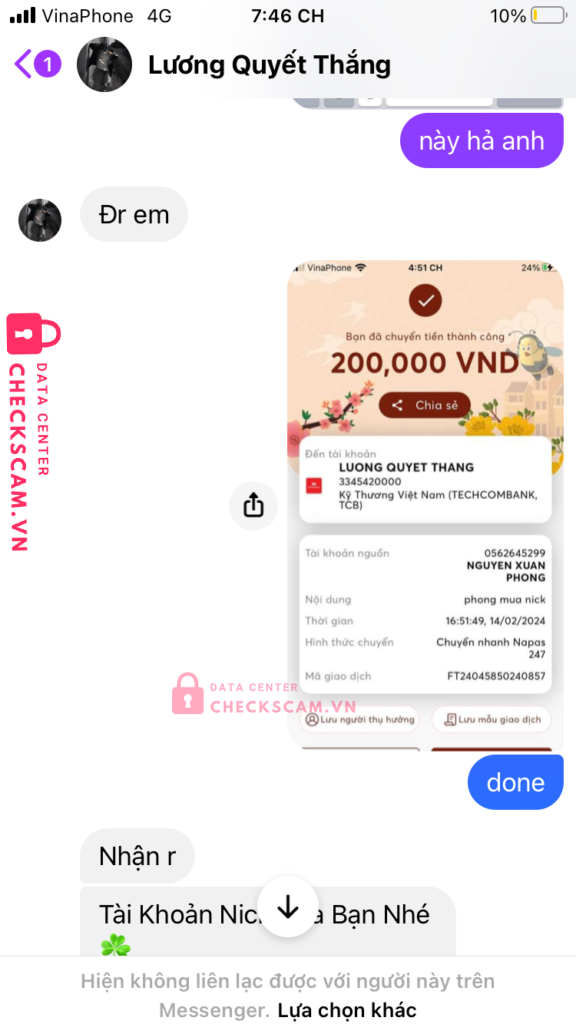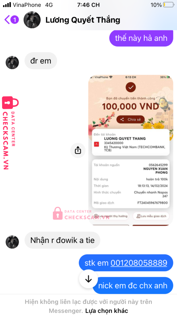 Scammer Alert: Lương Quyết Thắng Reported: November 16, 2024 Scammer Information Full Name: Lương Quyết Thắng Payment Gate: techcomback Payment Account: 3345420000 Category: Marketplace scams Source: Checkscam Evidence Files Report Description nó gửi tk mk xong nó ko đưa mã xác minh 2bước xong nó đòi thêm tiền để mở khoá tk Comments Your comment Add Comment No comments yet. Be the first to share your experience with this scammer.