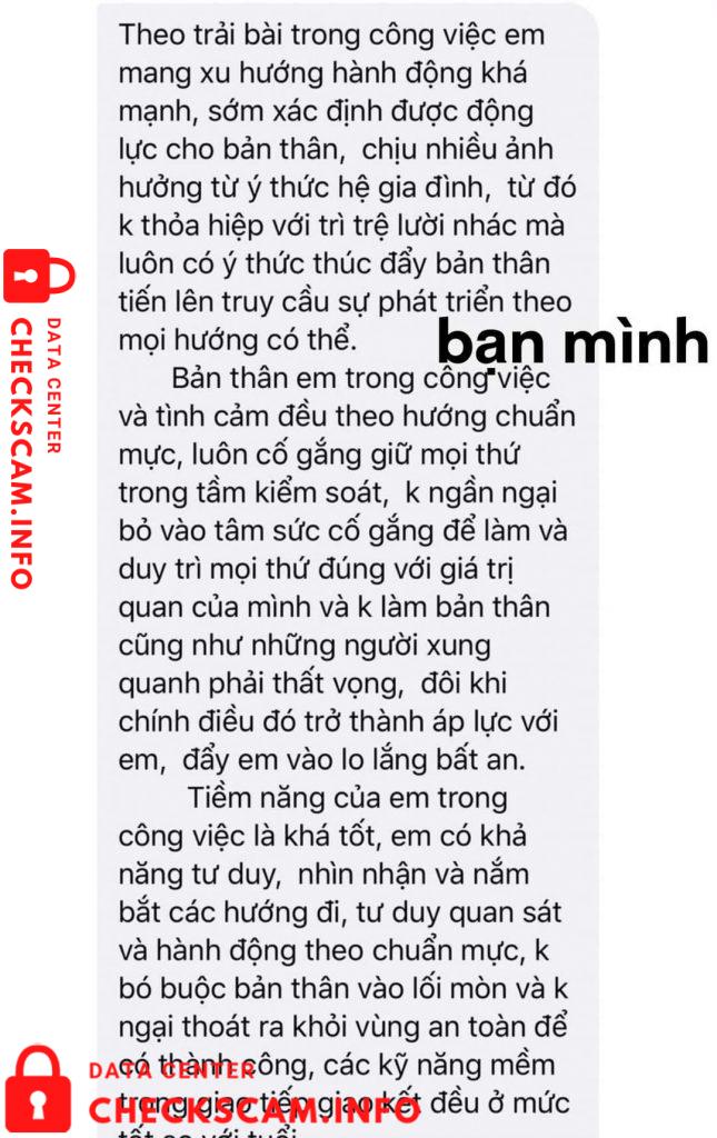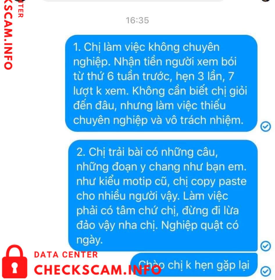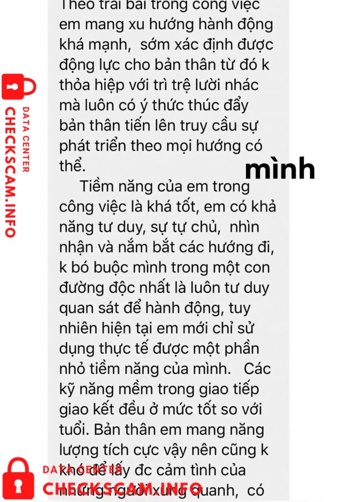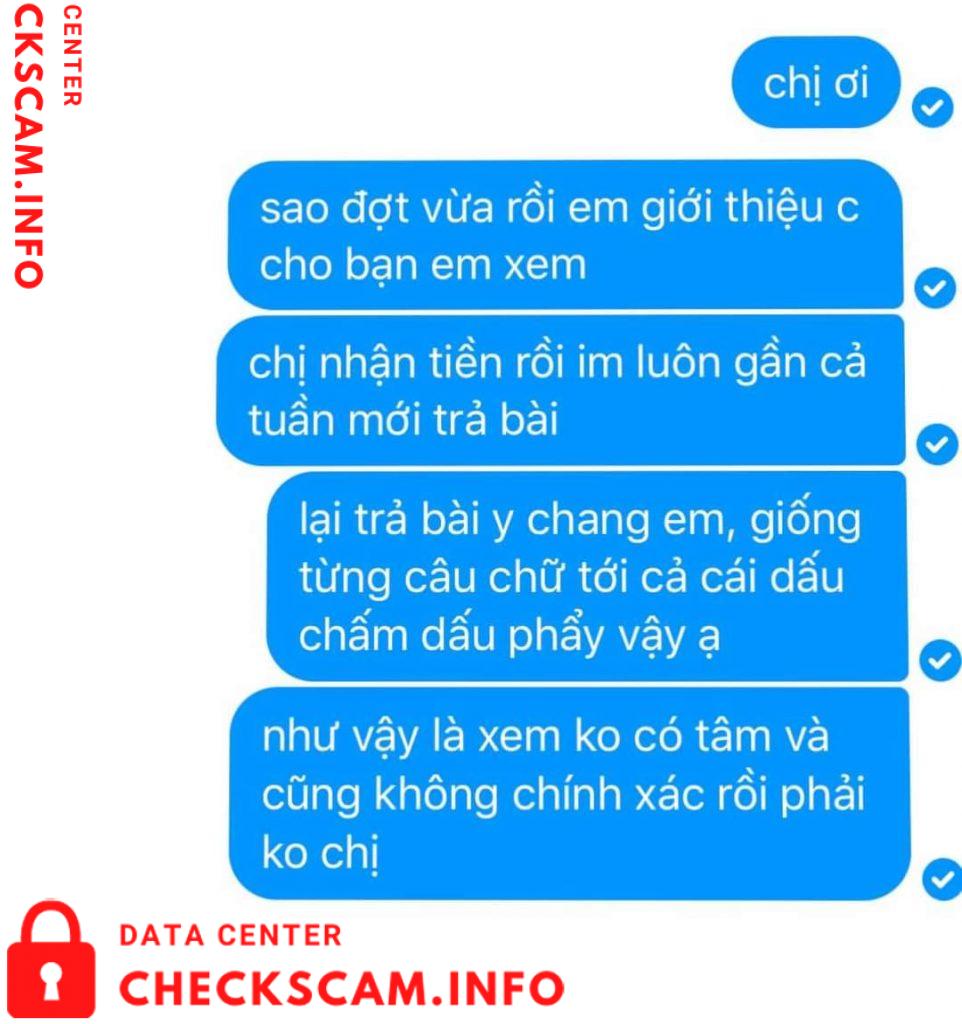 Mình book chị này xem tarot (bạn này xem qua Fb thấy rất nhiều feedback tốt và uy tín luôn), lần đầu xem rất suôn sẻ, tới lần 2 nhận tiền xong biến mất 1-2 ngày tới khi mình nhắn mãi “chị ơi chị à” mới chịu xem cho mình. Mình thấy trải bài khá dài , định hướng chi tiết nên mình khá tin tưởng và giới thiệu bạn mình xem. Bạn mình sau khi gửi tiền, và được hứa hẹn sáng hôm sau sẽ được trải bài thì again, bạn reader lại im luôn tới tận 6 ngày sau khi bạn mình nổi điên lên đòi tiền mới chịu trải bài. Sau khi trải bài cho bạn mình xong tụi mình mới phát hiện chị đó trải bài như kiểu copy paste, giống bài của mình tới gần 80%. Copy các đoạn trải bài tới nỗi giống nhau tới cái dấu chấm dấu phẩy. Bạn mình điên quá nhắn tin nói thì bị block luôn.