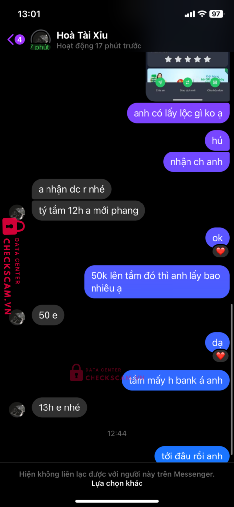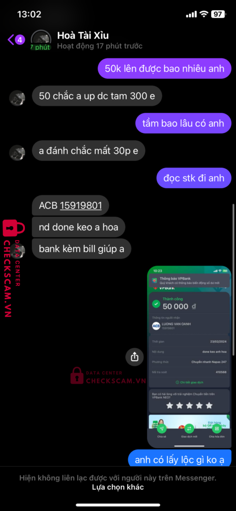 Scammer Alert: luong van oanh Reported: November 16, 2024 Scammer Information Full Name: luong van oanh Payment Gate: acb Payment Account: 15919801 Category: Marketplace scams Source: Checkscam Evidence Files Report Description lừa đảo kéo tài xỉu húp 10m Comments Your comment Add Comment No comments yet. Be the first to share your experience with this scammer.