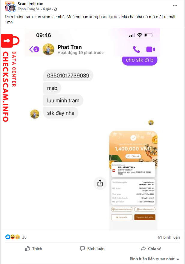Scammer Alert: LUU MINH TRAM Reported: November 16, 2024 Scammer Information Full Name: LUU MINH TRAM Payment Gate: MBBank Payment Account: 03501017739039 Category: Marketplace scams Source: Checkscam Evidence Files Report Description Scam. Né ra Comments Your comment Add Comment No comments yet. Be the first to share your experience with this scammer.