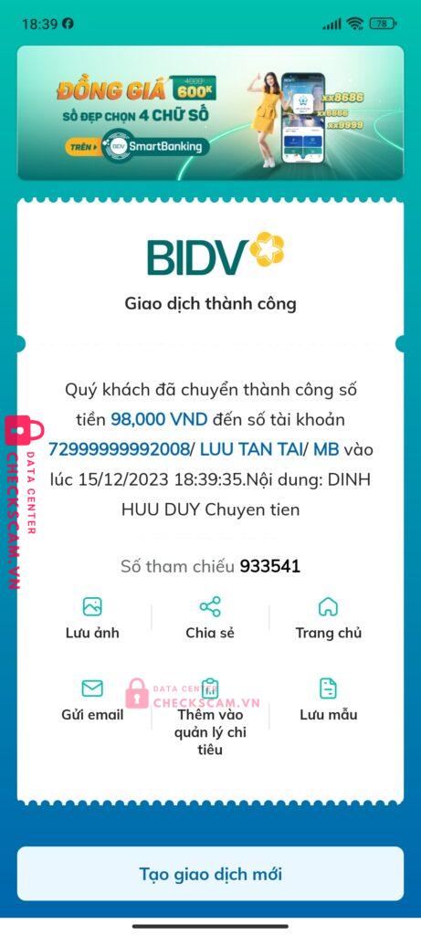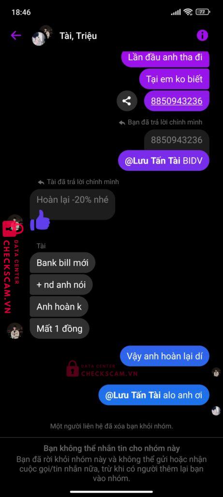 Scammer Alert: LUU TAN TAI Reported: November 16, 2024 Scammer Information Full Name: LUU TAN TAI Payment Gate: MB Bank Payment Account: 72999999992008 Category: Marketplace scams Source: Checkscam Evidence Files Report Description Bạn LUU TAN TAI có làm Giao Dịch Cho em và bạn Triệu Đạt Nhưng em chuyển khoản xong thì bị 2 bạn đấy kick và chăn trên mạng xã hội Comments Your comment Add Comment No comments yet. Be the first to share your experience with this scammer.
