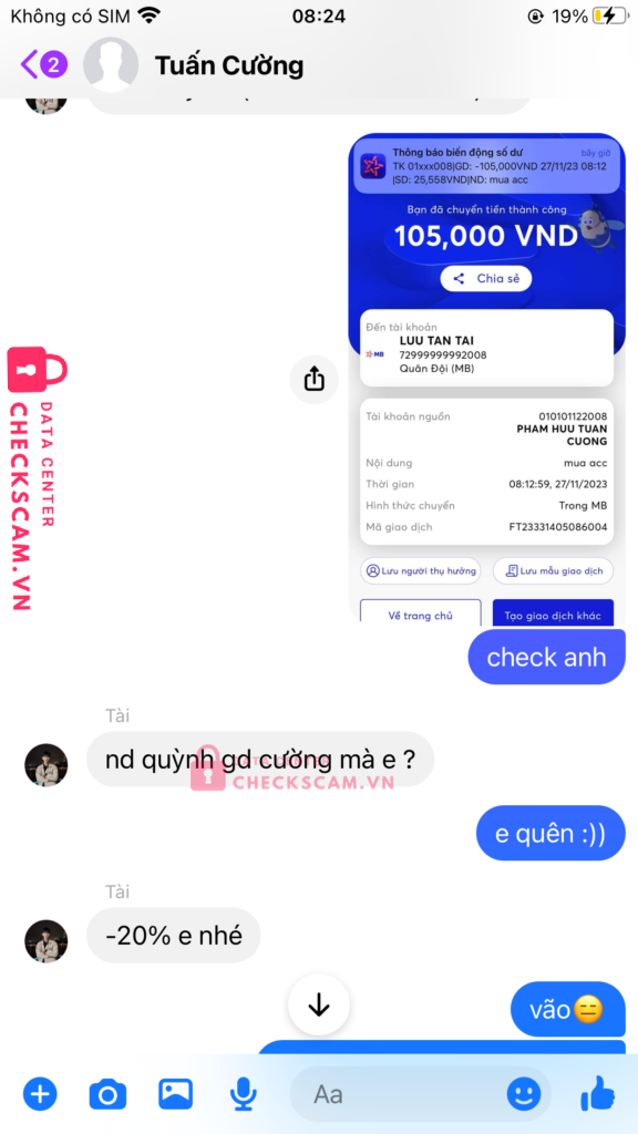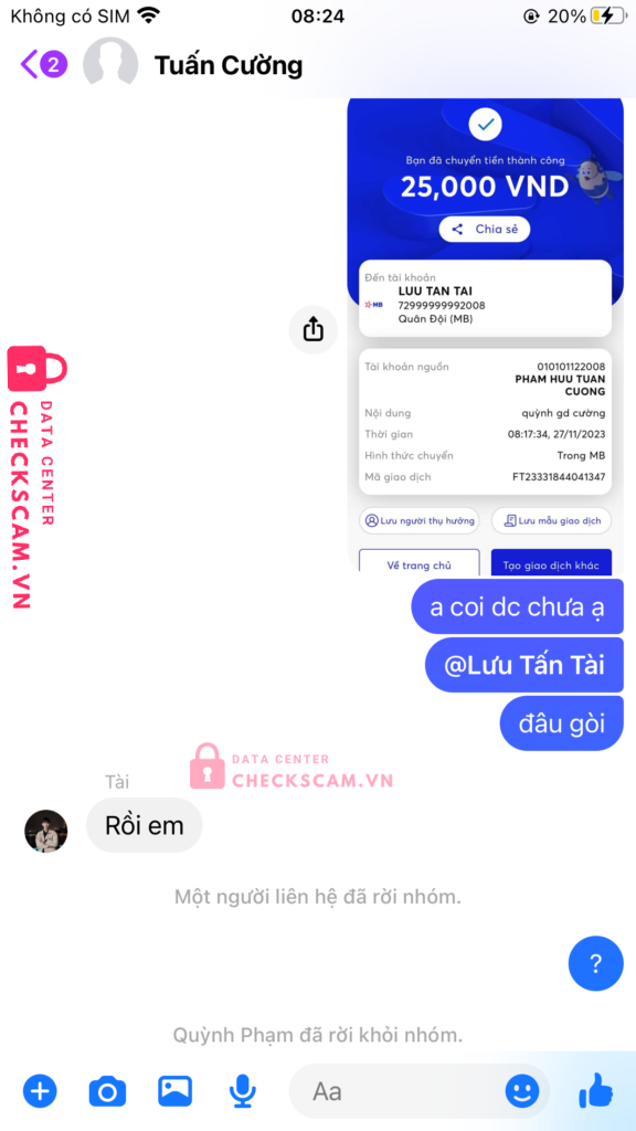 Scammer Alert: Luu Tan Tai Reported: November 16, 2024 Scammer Information Full Name: Luu Tan Tai Payment Gate: Mb Bank Payment Account: 72999999992008 Category: Marketplace scams Source: Checkscam Evidence Files Report Description em có gd với anh này thấy ad cũng khá uy tín nhưng sau khi em bank thì anh ấy rời khỏi nhóm và block em Comments Your comment Add Comment No comments yet. Be the first to share your experience with this scammer.