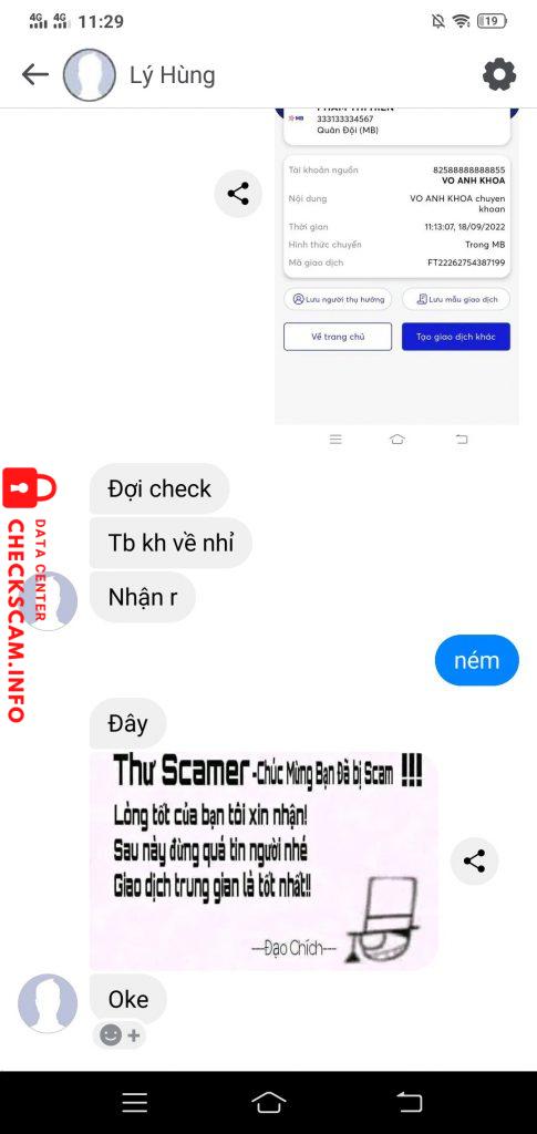 Scammer Alert: Lý Hùng Reported: November 16, 2024 Scammer Information Full Name: Lý Hùng Phone Number: 0398609213 Payment Gate: MB Bank Payment Account: 333133334567 Category: Marketplace scams Source: Checkscam Evidence Files Report Description scamer Comments Your comment Add Comment No comments yet. Be the first to share your experience with this scammer.