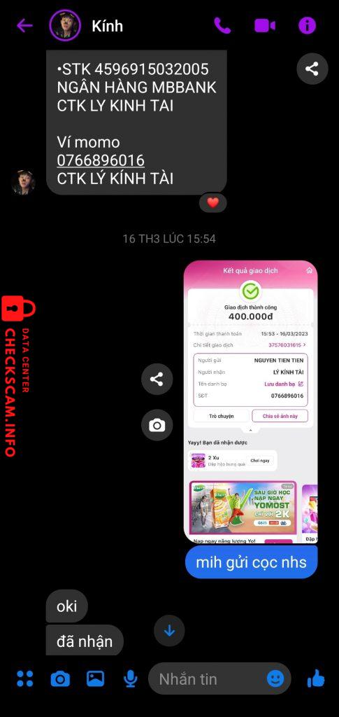 Scammer Alert: LY KINH PHAT Reported: November 16, 2024 Scammer Information Full Name: LY KINH PHAT Phone Number: 0766896016 Payment Gate: MB bank Payment Account: 4596915032005 Category: Marketplace scams Source: Checkscam Evidence Files Report Description nó lừa tôi 400k ae ạ, wall trông uy tín mà scam Comments Your comment Add Comment No comments yet. Be the first to share your experience with this scammer.