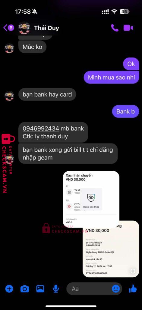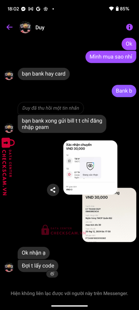 Scammer Alert: LY THANH DUY Reported: March 7, 2025 Scammer Information Full Name: LY THANH DUY Payment Gate: MB Payment Account: 0946992434 Category: Marketplace scams Source: Checkscam Evidence Files Report Description Mua nick, chờ Bank r block Comments Your comment Add Comment No comments yet. Be the first to share your experience with this scammer.