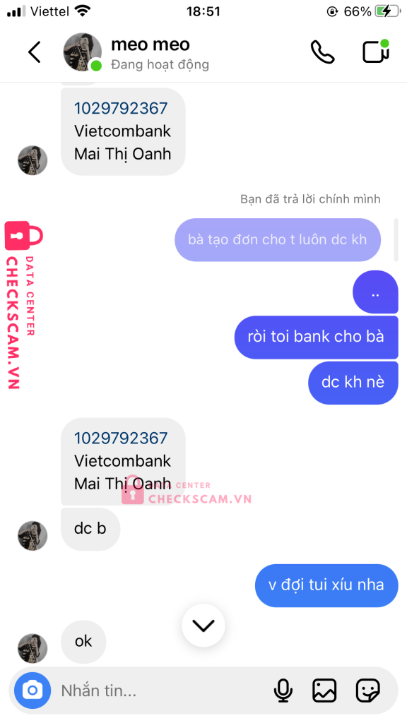 Scammer Alert: Mai Thị Oanh Reported: November 16, 2024 Scammer Information Full Name: Mai Thị Oanh Payment Gate: vietcombank Payment Account: 1029792367 Category: Marketplace scams Source: Checkscam Evidence Files Report Description lừa từ trên tiktok pass đồ rồi cọc ạ. 1 người bị lừa nó up feedback như kiểu uy tín để lừa thêm rất nhiều người nữa ạ. mng chú ý nhé? Comments Your comment Add Comment No comments yet. Be the first to share your experience with this scammer.