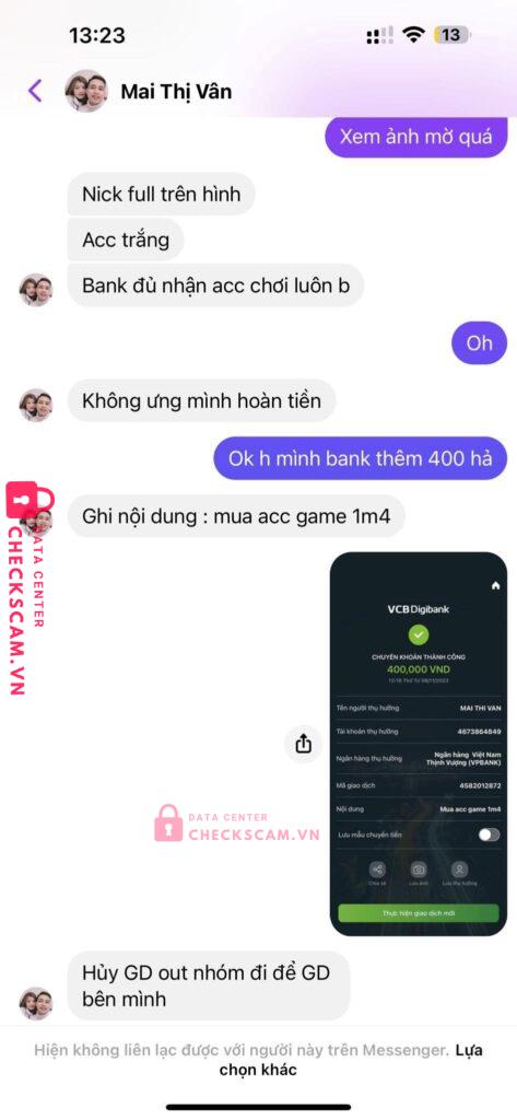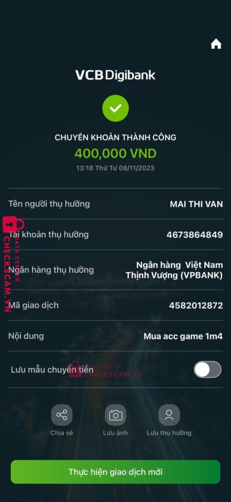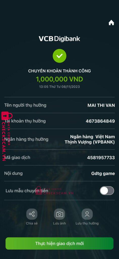 Scammer Alert: MAI THI VAN Reported: November 16, 2024 Scammer Information Full Name: MAI THI VAN Payment Gate: VP BANK Payment Account: 4673864849 Category: Marketplace scams Source: Checkscam Evidence Files Report Description Comments Your comment Add Comment No comments yet. Be the first to share your experience with this scammer.