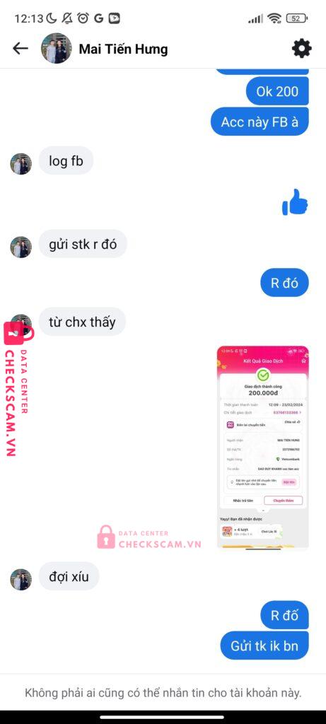 Scammer Alert: MAI TIEN HUNG Reported: November 16, 2024 Scammer Information Full Name: MAI TIEN HUNG Payment Gate: Vietcombank Payment Account: 3372986702 Category: Marketplace scams Source: Checkscam Evidence Files Report Description Nó bịp 200k xong ko gửi acc. Tổ cha nhà thằng Mai Tiến Hưng mong cho thng này nghiệp xe tông chêt mẹ nó Comments Your comment Add Comment No comments yet. Be the first to share your experience with this scammer.