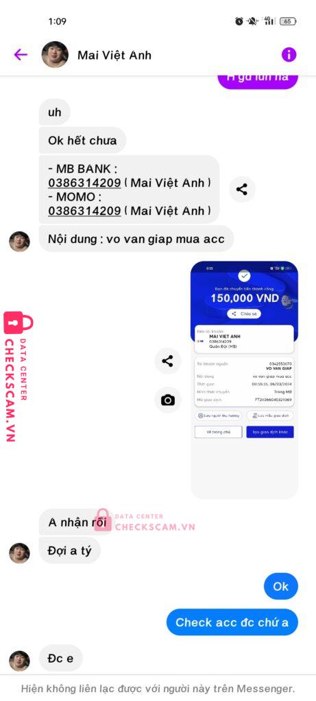 Scammer Alert: Mai Việt Anh Reported: November 16, 2024 Scammer Information Full Name: Mai Việt Anh Payment Gate: Mb bank Payment Account: 0386314209 Category: Marketplace scams Source: Checkscam Evidence Files Report Description Thấy check scam cũng ok Sau chuyển khoản thì chặn Comments Your comment Add Comment No comments yet. Be the first to share your experience with this scammer.