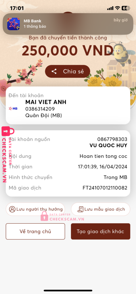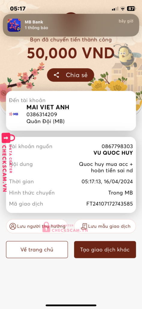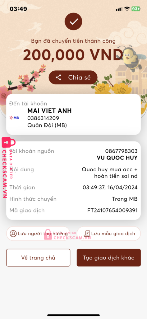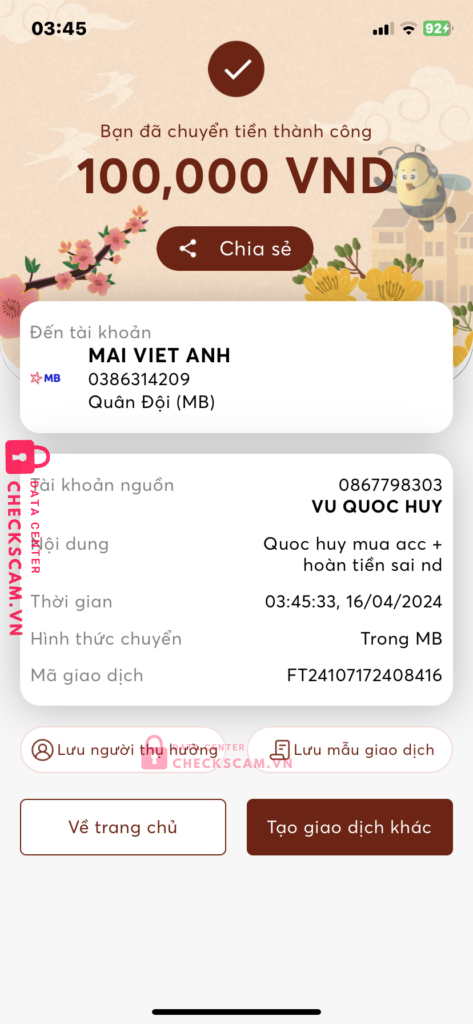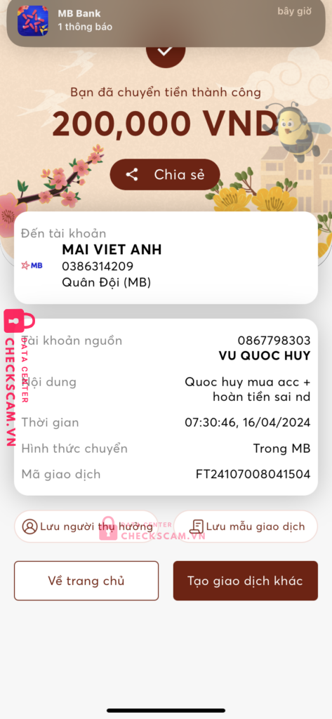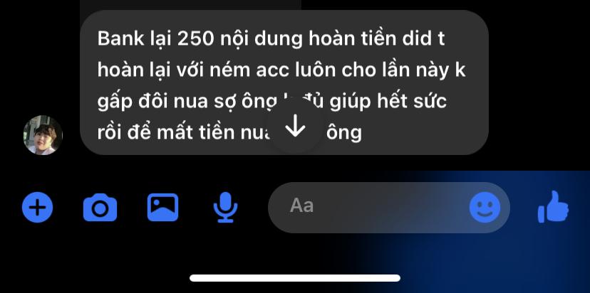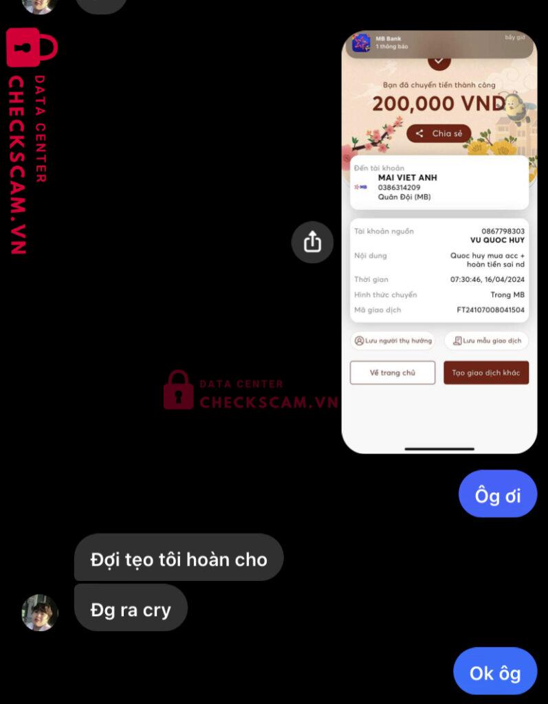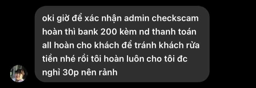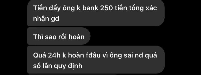 Ban đầu e có mua của a này acc 100 nhm e quên ghi nội dung ổng bảo chuyển 200k với nd hoàn tiền xg sẽ đưa acc + hoàn tiền , lúc sau ổng lại bảo chuyển thêm 200 để lấy acc khác e lần đầu mua acc nên cx ngu ngơ k để ý nd xg ổng bắt e chuyển thêm 250k để hoàn tiền với lấy acc, ổng bảo 1 tí sẽ hoàn lại cho e đủ số tiền,r 1 lúc sau ổng lại lật lọc bảo sếp ổng bắt chuyển 500k mới cho hoàn. Mong ad xem xét