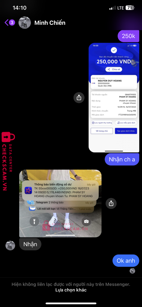 Scammer Alert: MINH CHIEN Reported: November 16, 2024 Scammer Information Full Name: MINH CHIEN Payment Gate: MB BANK Payment Account: 55555500000 Category: Marketplace scams Source: Checkscam Evidence Files Report Description Lừa đảo Comments Your comment Add Comment No comments yet. Be the first to share your experience with this scammer.