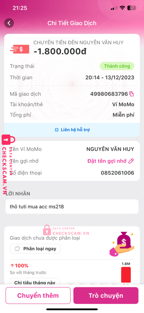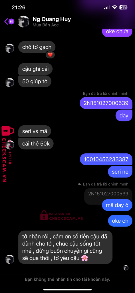 Scammer Alert: Ng quang huy Reported: November 16, 2024 Scammer Information Full Name: Ng quang huy Payment Gate: Momo Payment Account: 0852061006 Category: Marketplace scams Source: Checkscam Evidence Files Report Description Comments Your comment Add Comment No comments yet. Be the first to share your experience with this scammer.