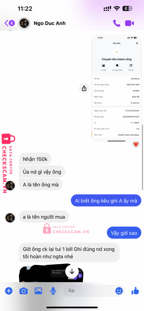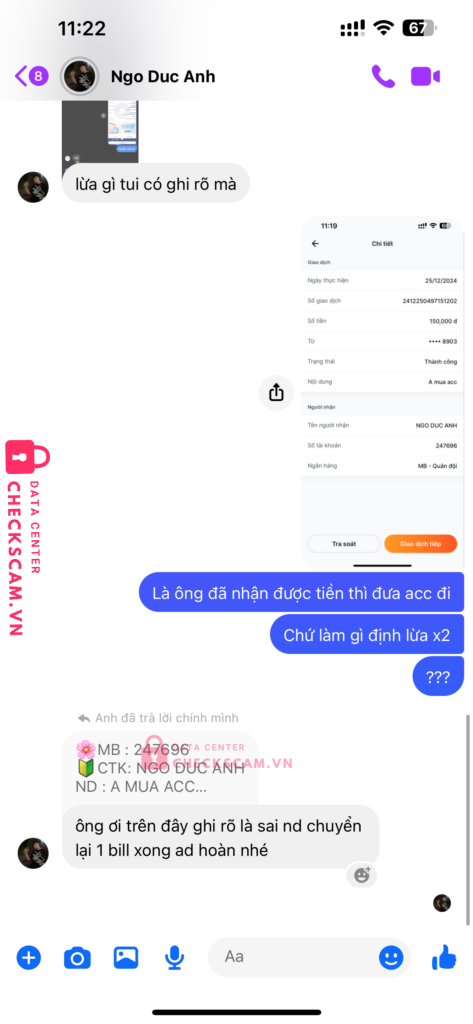 Scammer Alert: Ngô Đức Anh Reported: March 7, 2025 Scammer Information Full Name: Ngô Đức Anh Payment Gate: MB Payment Account: 247696 Category: Marketplace scams Source: Checkscam Evidence Files Report Description Kêu chuyển 150k chuyển xong giờ kêu chuyển thêm 150k để hoàn Comments Your comment Add Comment No comments yet. Be the first to share your experience with this scammer.