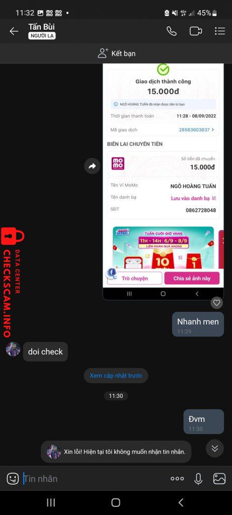 Scammer Alert: Ngô hoàng tuấn Reported: November 16, 2024 Scammer Information Full Name: Ngô hoàng tuấn Phone Number: 0862728048 Payment Gate: Momo Payment Account: 0862728048 Category: Marketplace scams Source: Checkscam Evidence Files Report Description Scam lừa bán fb Comments Your comment Add Comment No comments yet. Be the first to share your experience with this scammer.