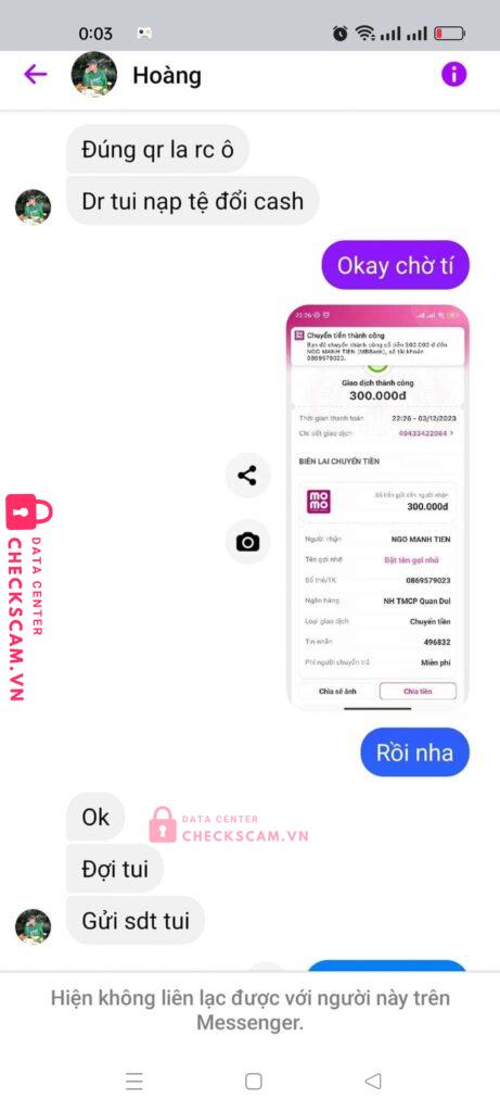Scammer Alert: NGO MANH TIEN Reported: November 16, 2024 Scammer Information Full Name: NGO MANH TIEN Payment Gate: MBBANK Payment Account: 0869579023 Category: Marketplace scams Source: Checkscam Evidence Files Report Description Tui mua wechat của nó mà nó ko gửi acc 3th và block tôi. Thiệt hại tôi phải chịu là 300k mong admin duyệt Comments Your comment Add Comment No comments yet. Be the first to share your experience with this scammer.