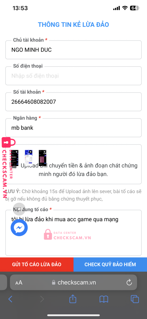 Scammer Alert: NGO MINH DUC Reported: November 16, 2024 Scammer Information Full Name: NGO MINH DUC Phone Number: 0326345111 Payment Gate: MB bank Payment Account: 26664608082007 Category: Marketplace scams Source: Checkscam Evidence Files Report Description tôi bị lừa đảo khi mua acc game qua mạng người lừa đảo đã lừa 50k của tôi và nói cọc web này Comments Your comment Add Comment No comments yet. Be the first to share your experience with this scammer.