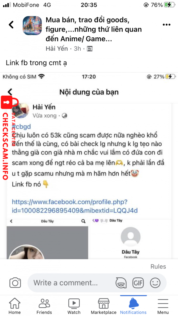 Đăng bán card/đồ bông anime bằng hình thức chuyển khoản, có check legit, quay clip check hàng có kèm nametag nhưng khi nạn nhân chuyển khoản đầy đủ/cọc thì xoá acc FB