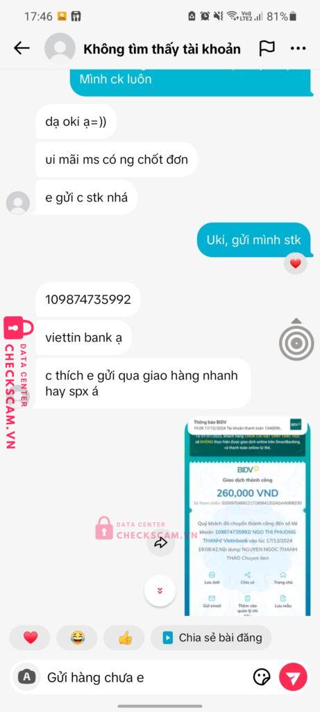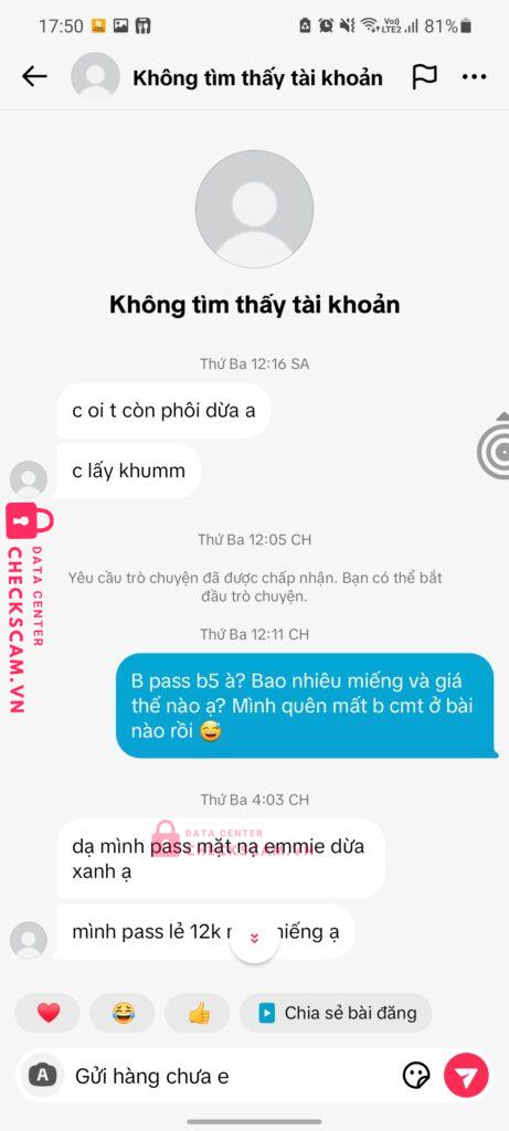 Bạn này lừa đảo, mình mua đồ của bạn í qua Tiktok shop. Mình bank tiền hàng hết 260k, vẫn nhắn tin xác nhận địa chỉ bình thường. Bạn này còn nhắn thêm bảo mình lấy thêm vài món nữa ( Chắc thấy mình dễ nên tính mồi chài lừa thêm ). Sang hôm sau bạn ấy đã xóa tài khoản hoặc đã chặn mình rồi.