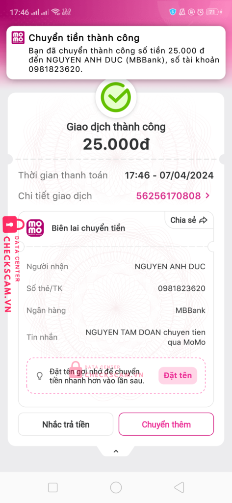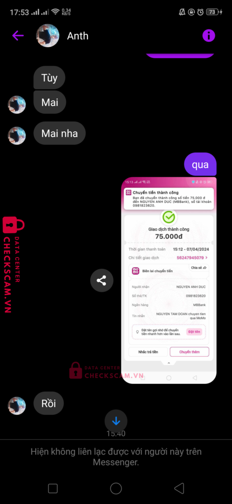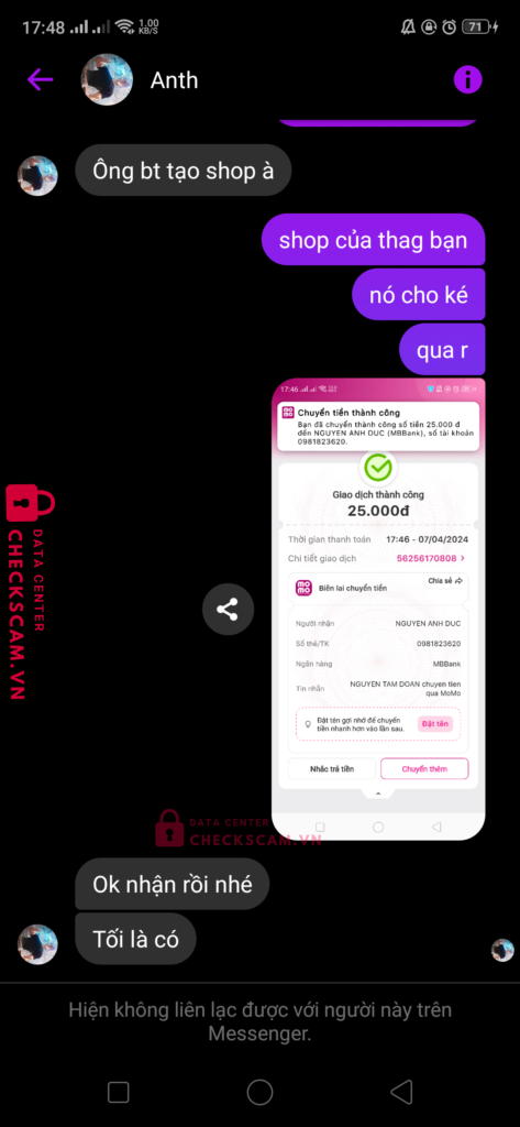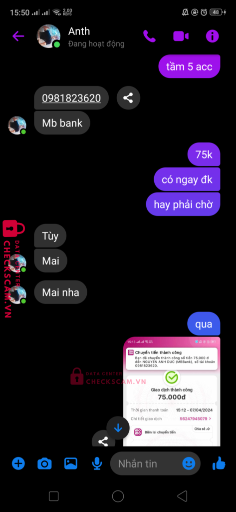 Scammer Alert: NGUYEN ANH DUC Reported: November 16, 2024 Scammer Information Full Name: NGUYEN ANH DUC Payment Gate: MB Bank Payment Account: 0981823620 Category: Marketplace scams Source: Checkscam Evidence Files Report Description mua acc blox fruits xong bảo chờ và block Comments Your comment Add Comment No comments yet. Be the first to share your experience with this scammer.