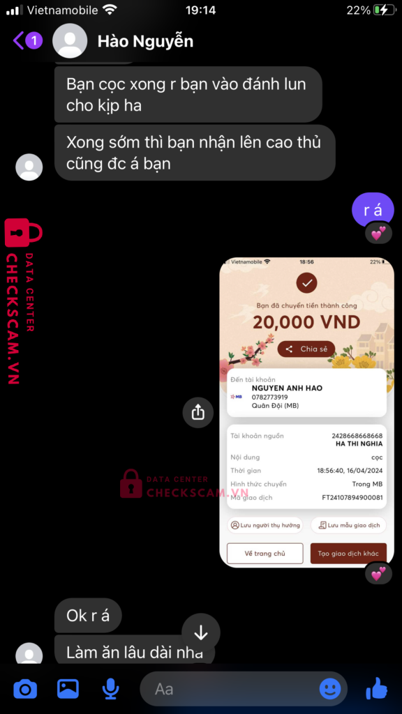 Scammer Alert: Nguyen Anh Hao Reported: November 16, 2024 Scammer Information Full Name: Nguyen Anh Hao Payment Gate: Mb bank Payment Account: 0782773919 Category: Marketplace scams Source: Checkscam Evidence Files Report Description Comments Your comment Add Comment No comments yet. Be the first to share your experience with this scammer.