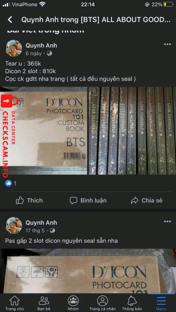 Còn này nó tên thật là Nguyễn Quỳnh Anh, chuyên đăng lên mấy gr là bán dicon 699k , 810k rồi bán alb 365k cọc gdtt Nha Trang ấy bài đăng của nó t để ở trên