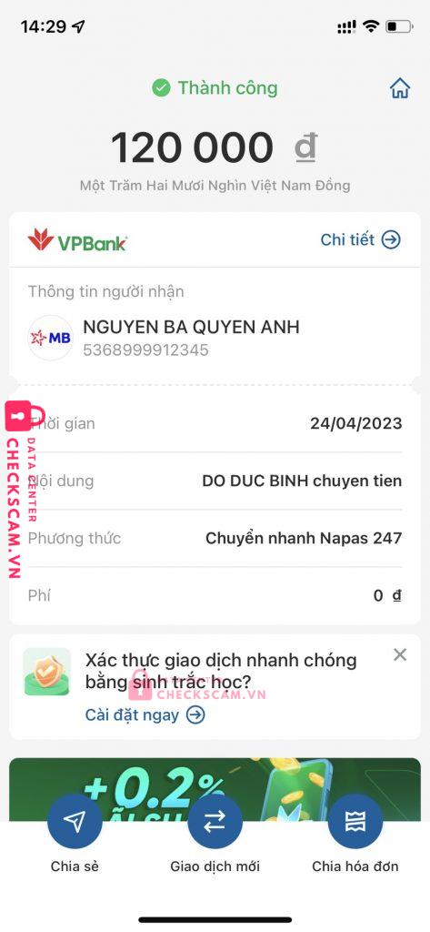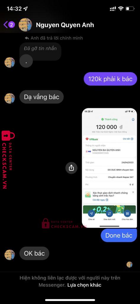 Scammer Alert: NGUYEN BA QUYEN ANH Reported: November 16, 2024 Scammer Information Full Name: NGUYEN BA QUYEN ANH Payment Gate: MB BANK Payment Account: 5368999912345 Category: Marketplace scams Source: Checkscam Evidence Files Report Description scam bán tài khoản Comments Your comment Add Comment No comments yet. Be the first to share your experience with this scammer.