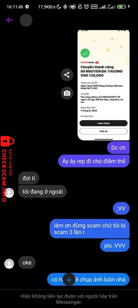Scammer Alert: Nguyen Ba Thuong Reported: November 16, 2024 Scammer Information Full Name: Nguyen Ba Thuong Payment Gate: Viettinbank Payment Account: 104870712757 Category: Marketplace scams Source: Checkscam Evidence Files Report Description Lừa đảo mua truyện boom hàng Comments Your comment Add Comment No comments yet. Be the first to share your experience with this scammer.