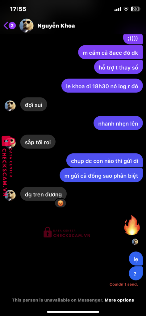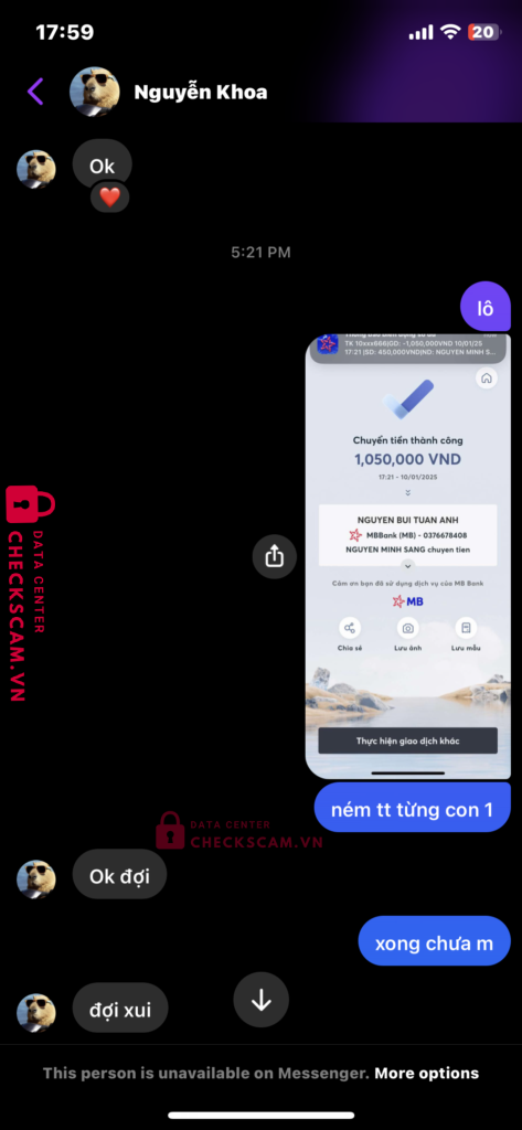 Scammer Alert: Nguyễn Bùi Tuấn Anh Reported: March 7, 2025 Scammer Information Full Name: Nguyễn Bùi Tuấn Anh Payment Gate: Mb bank Payment Account: 0376678408 Category: Marketplace scams Source: Checkscam Evidence Files Report Description em có mua 8 acc zalo bên thằng này em bank trước là vì trước đó có mua acc ff nhiều lần bên nó rồi bank xong thì nó chặn luôn Comments Your comment Add Comment No comments yet. Be the first to share your experience with this scammer.