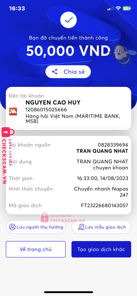 Scammer Alert: nguyễn cao huy Reported: November 16, 2024 Scammer Information Full Name: nguyễn cao huy Payment Gate: msb hàng hải Payment Account: 12086015025666 Category: Marketplace scams Source: Checkscam Evidence Files Report Description mua bán 3g lậu scam tiền khách bank Comments Your comment Add Comment No comments yet. Be the first to share your experience with this scammer.