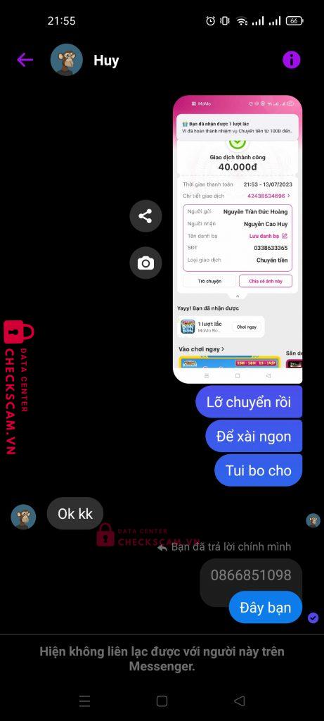 Scammer Alert: Nguyễn Cao Huy Reported: November 16, 2024 Scammer Information Full Name: Nguyễn Cao Huy Phone Number: 0338633365 Payment Gate: Momo Payment Account: 0338633365 Category: Marketplace scams Source: Checkscam Evidence Files Report Description Có 40k cũng scam rác vc Comments Your comment Add Comment No comments yet. Be the first to share your experience with this scammer.