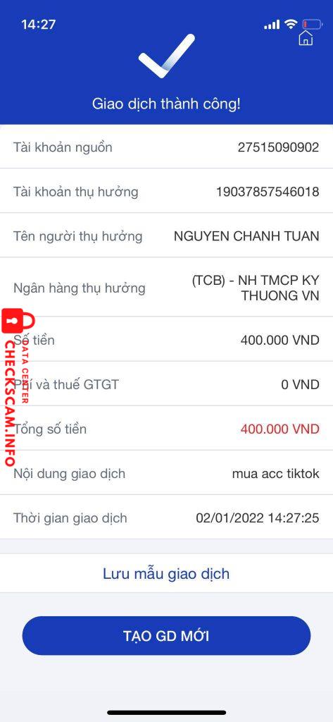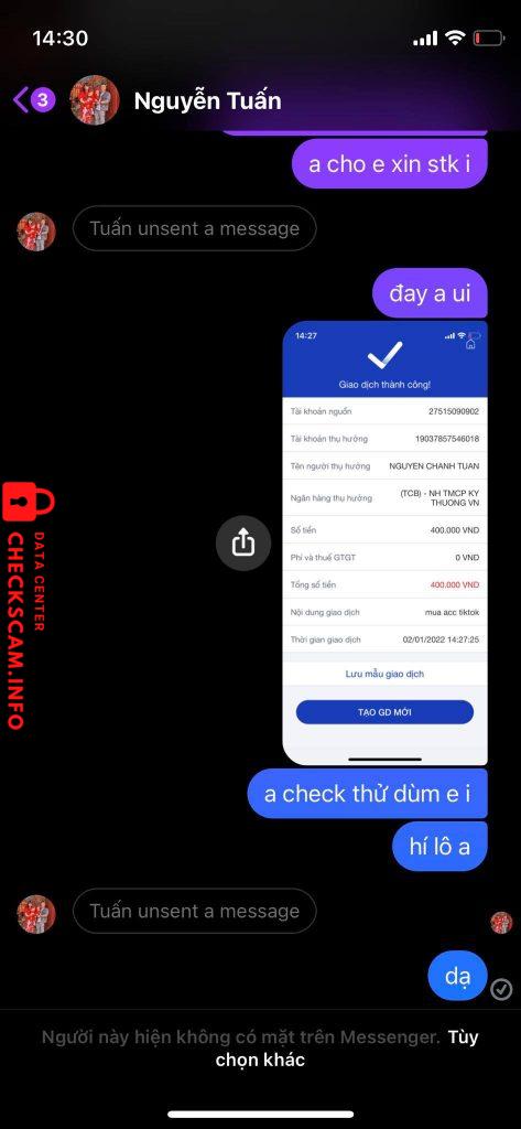 Scammer Alert: Nguyễn Chánh Tuấn Reported: November 16, 2024 Scammer Information Full Name: Nguyễn Chánh Tuấn Payment Gate: techcombank Payment Account: 19036556451015 Category: Marketplace scams Source: Checkscam Evidence Files Report Description scam tiền acc tiktok Comments Your comment Add Comment No comments yet. Be the first to share your experience with this scammer.