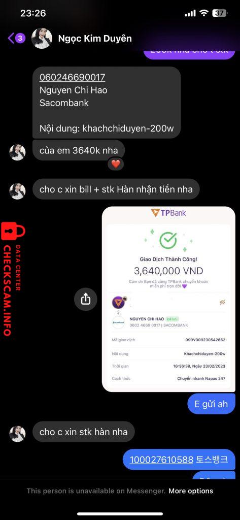 Scammer Alert: Nguyen Chi Hao Reported: November 16, 2024 Scammer Information Full Name: Nguyen Chi Hao Payment Gate: Sacombank Payment Account: 060246690017 Category: Marketplace scams Source: Checkscam Evidence Files Report Description Nhận mua bán won tay ba nhưng sau khi chuyển khoản đã khoá fb khách. Facebook làm giả taọ uy tín giả. Chủ tài khoản nhận tiền việt không khớp với tên. Comments Your comment Add Comment No comments yet. Be the first to share your experience with this scammer.