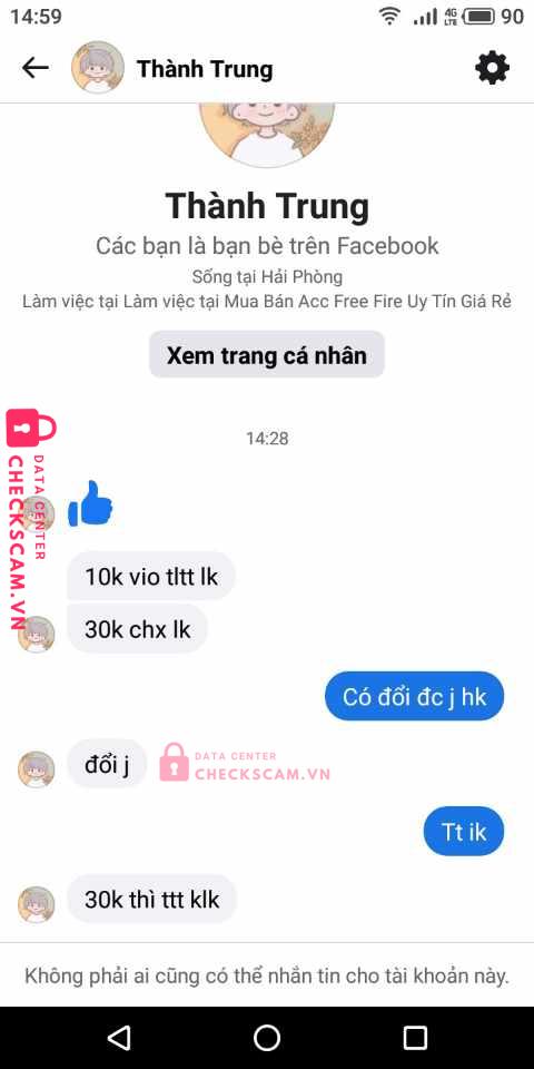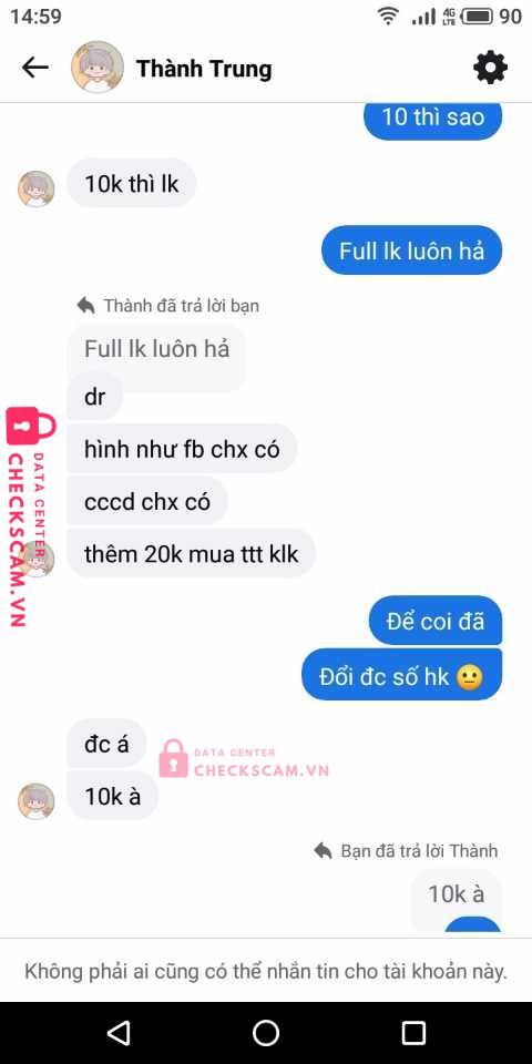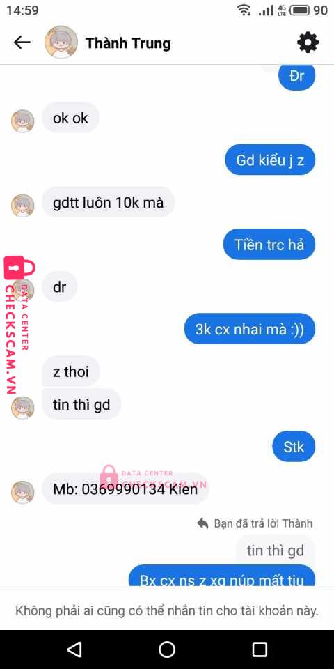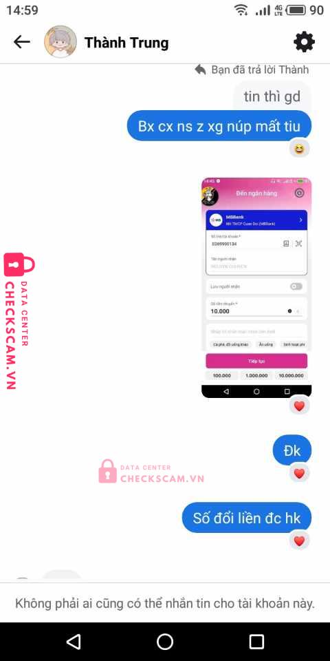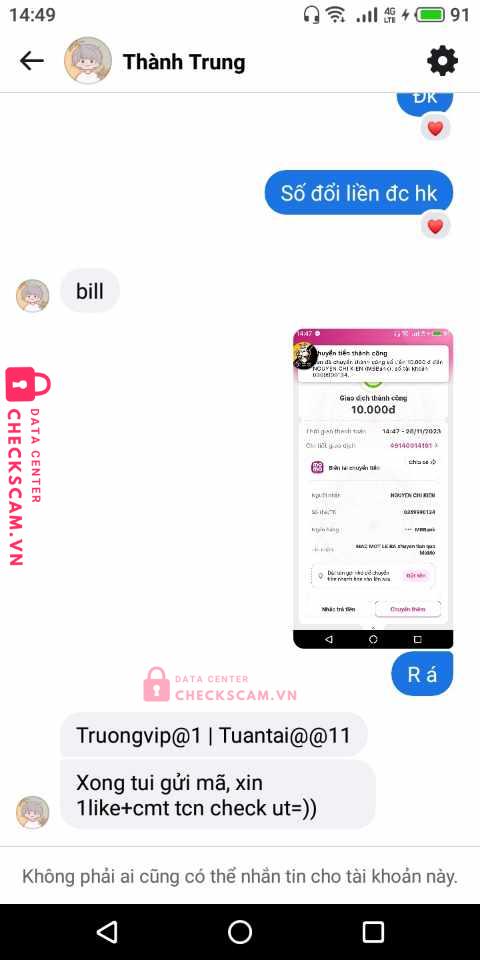 Scammer Alert: Nguyễn Chí Kiên Reported: November 16, 2024 Scammer Information Full Name: Nguyễn Chí Kiên Payment Gate: MB Payment Account: 0369990134 Category: Marketplace scams Source: Checkscam Evidence Files Report Description Em bị nó scam 10k giao tk mk sai 10k không lớn xong nó block em ạ Comments Your comment Add Comment No comments yet. Be the first to share your experience with this scammer.