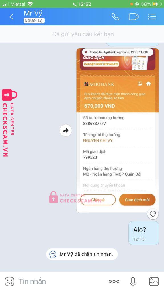Scammer Alert: Nguyễn chí Vỹ Reported: November 16, 2024 Scammer Information Full Name: Nguyễn chí Vỹ Phone Number: 0879775528 Payment Gate: MB Bank Payment Account: 8386837777 Category: Marketplace scams Source: Checkscam Evidence Files Report Description Mua acc, bank tiền xong thì block, không đưa acc Comments Your comment Add Comment No comments yet. Be the first to share your experience with this scammer.