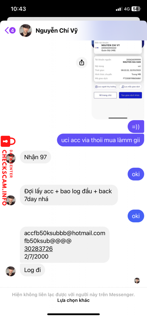Scammer Alert: Nguyễn Chí Vỹ Reported: November 16, 2024 Scammer Information Full Name: Nguyễn Chí Vỹ Payment Gate: mb bank Payment Account: 220022200222 Category: Marketplace scams Source: Checkscam Evidence Files Report Description Scam Comments Your comment Add Comment No comments yet. Be the first to share your experience with this scammer.
