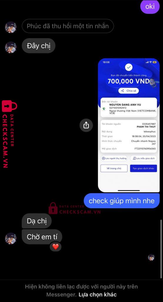 Scammer Alert: Nguyen Dang Anh Vu Reported: November 16, 2024 Scammer Information Full Name: Nguyen Dang Anh Vu Payment Gate: VCB Payment Account: 0271001092972 Category: Marketplace scams Source: Checkscam Evidence Files Report Description Lừa đảo cọc tiền xin việc làm sale, ngu vcl vẫn có ng bị đhs Comments Your comment Add Comment No comments yet. Be the first to share your experience with this scammer.