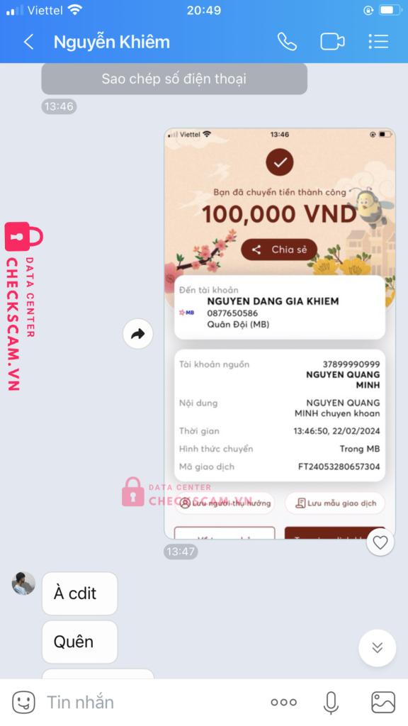 Scammer Alert: NGUYEN DANG GIA KHIEM Reported: November 16, 2024 Scammer Information Full Name: NGUYEN DANG GIA KHIEM Payment Gate: MB Bank Payment Account: 0877650586 Category: Marketplace scams Source: Checkscam Evidence Files Report Description Scam back acc mọi người nên tránh nhé Comments Your comment Add Comment No comments yet. Be the first to share your experience with this scammer.