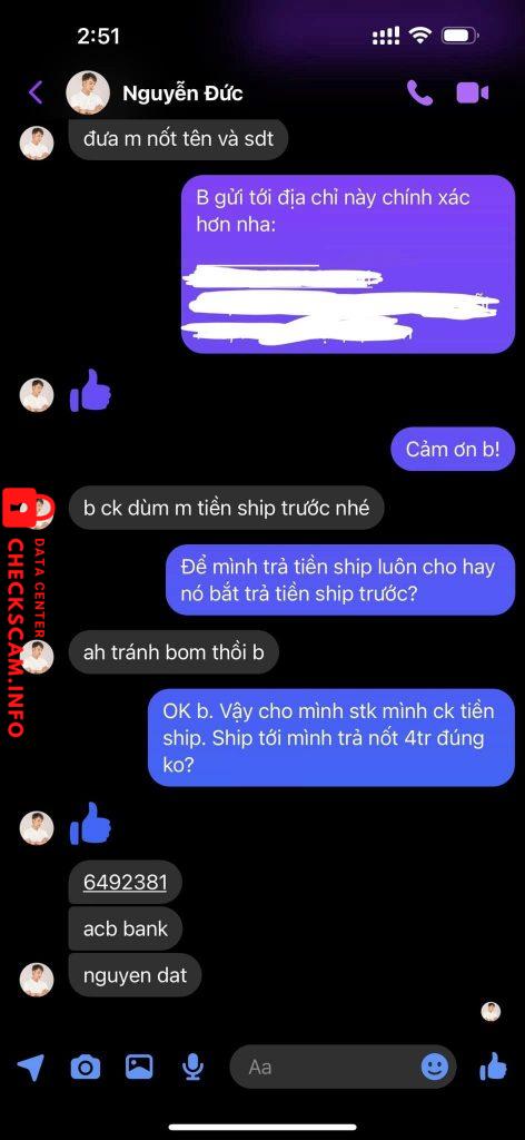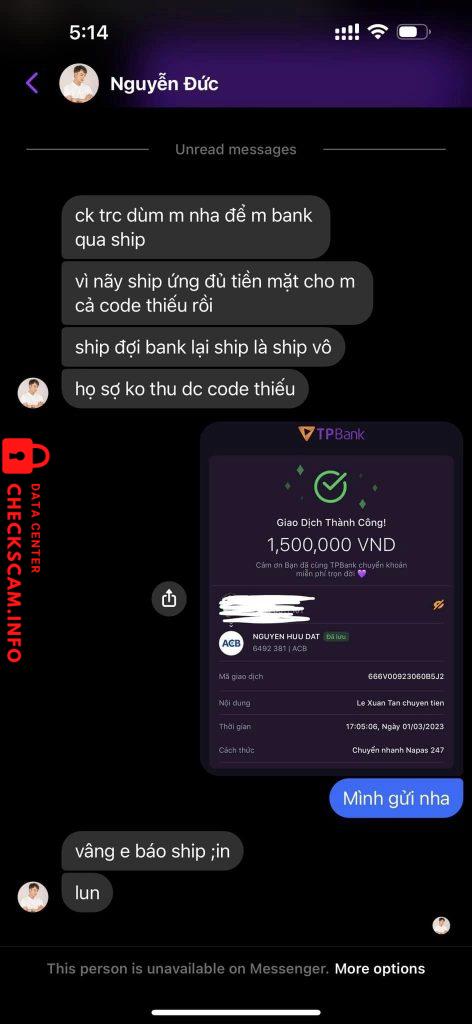 Scammer Alert: Nguyen Dat Reported: November 16, 2024 Scammer Information Full Name: Nguyen Dat Payment Gate: acb Payment Account: 6492381 Category: Marketplace scams Source: Checkscam Evidence Files Report Description Scam trên group Loa, khi ck rồi chặn luôn Comments Your comment Add Comment No comments yet. Be the first to share your experience with this scammer.