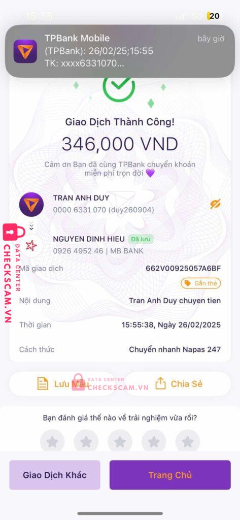 Scammer Alert: NGUYEN DINH HIEU Reported: March 7, 2025 Scammer Information Full Name: NGUYEN DINH HIEU Payment Gate: Mb bank Payment Account: 0926495246 Category: Marketplace scams Source: Checkscam Evidence Files Report Description Lúc đầu mua bán trung gian rất bình thường mình cũng đã thay đổi tất cả thông tin mật khẩu nhưng không hiểu sao sau 1 ngày bạn ấy lại có thể back acc Comments Your comment Add Comment No comments yet. Be the first to share your experience with this scammer.