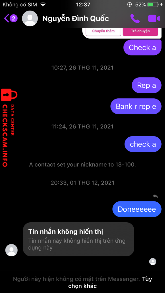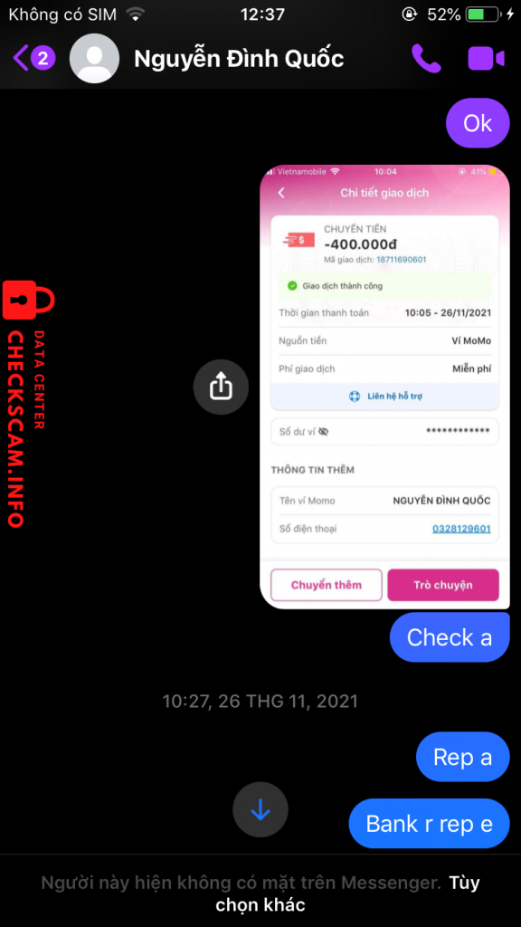 Scammer Alert: Nguyễn Đình Quốc Reported: November 16, 2024 Scammer Information Full Name: Nguyễn Đình Quốc Payment Gate: Momo Payment Account: 0328129601 Category: Marketplace scams Source: Checkscam Evidence Files Report Description Bank xong vài hôm sau die acc rồi ib acc mới xong block ? Comments Your comment Add Comment No comments yet. Be the first to share your experience with this scammer.