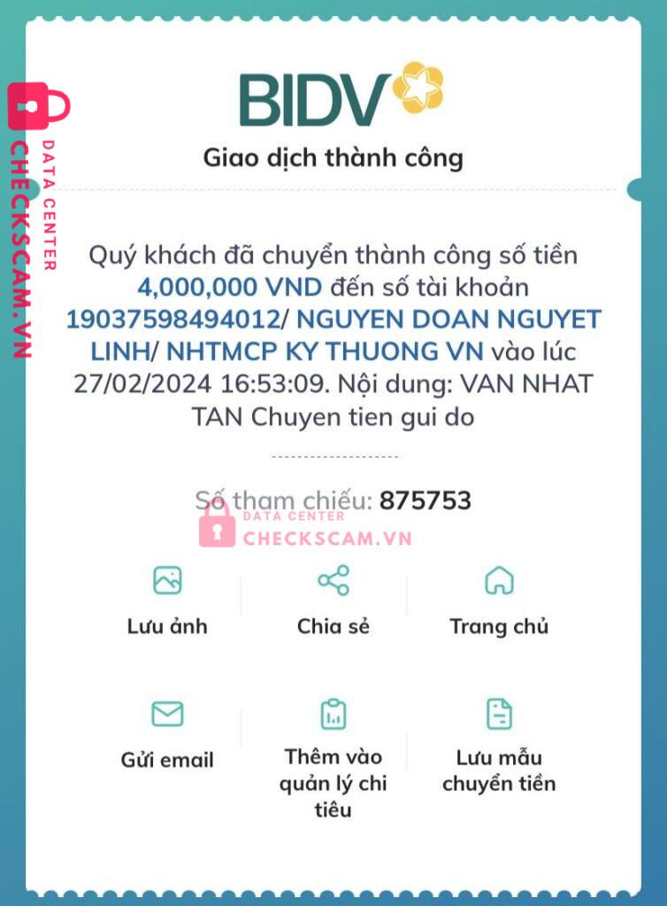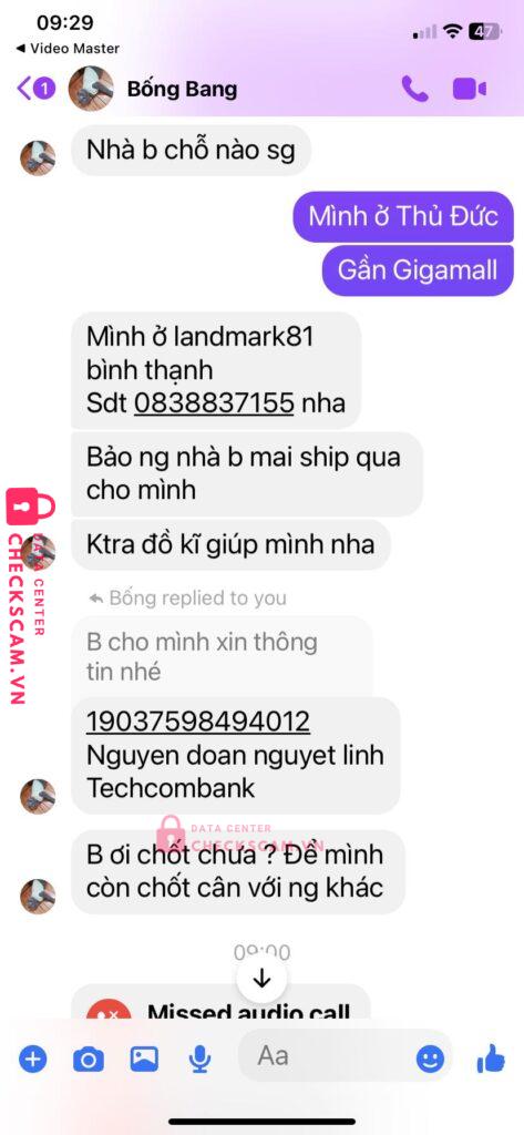 Scammer Alert: Nguyễn Đoàn Nguyệt Linh Reported: November 16, 2024 Scammer Information Full Name: Nguyễn Đoàn Nguyệt Linh Payment Gate: Techcombank Payment Account: 19037598494012 Category: Marketplace scams Source: Checkscam Evidence Files Report Description Đối tượng này nhận vận chuyển hàng đi nước ngoài , kêu chuyển khoản xong chặn FB , chặn điện thoại , chiếm đoạt tiền ck Comments Your comment Add Comment No comments yet. Be the first to share your experience with this scammer.