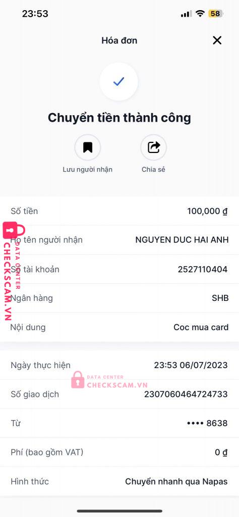 Scammer Alert: NGUYEN DUC HAI ANH Reported: November 16, 2024 Scammer Information Full Name: NGUYEN DUC HAI ANH Payment Gate: SHB Payment Account: 2527110404 Category: Marketplace scams Source: Checkscam Evidence Files Report Description Lừa cọc mua bán linh kiện máy tính Comments Your comment Add Comment No comments yet. Be the first to share your experience with this scammer.