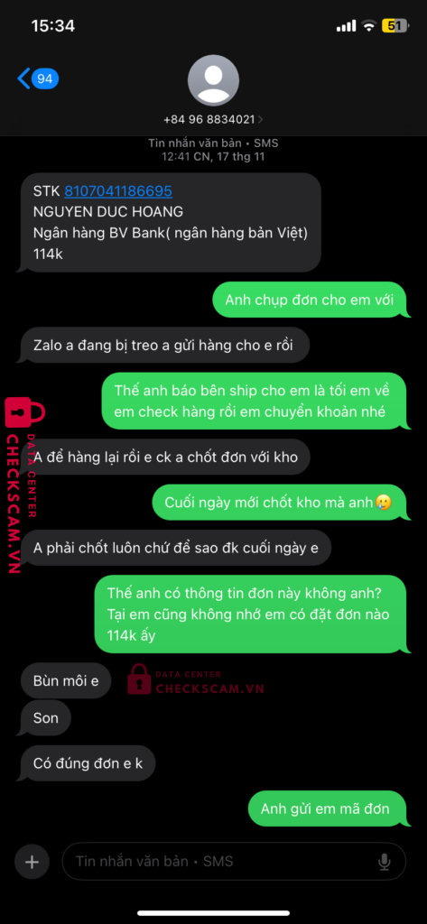 Lần 2: (15:20 ngày 28/12) gọi điện hỏi tôi đơn lần 1 lừa kia tôi đã thanh toán chưa, tôi trả lời đơn đấy người khác giao và t đã chuyển khoản rồi, nó bảo nó nhận dc rồi (!?) nhưng lỡ nhập thông tin t vào phần đăng kí thành viên nên cần t chuyển lại để nó huỷ thành viên:))) tôi biết là lừa đảo nên bảo “lừa đảo thì gọi người khác, đừng gọi cho t” thế là nó cúp máy