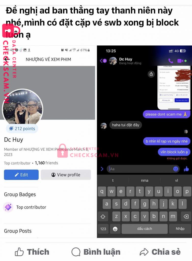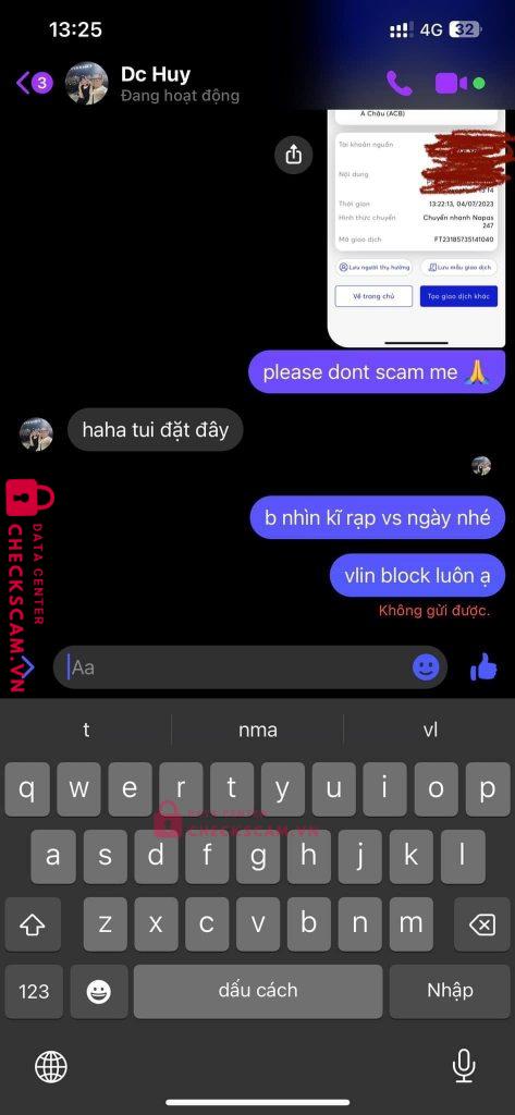 Scammer Alert: Nguyễn Đức Huy Reported: November 16, 2024 Scammer Information Full Name: Nguyễn Đức Huy Payment Gate: ACB Payment Account: 9631001 Category: Marketplace scams Source: Checkscam Evidence Files Report Description Nhận nhượng vé nhưng khi ck xong thì chuồn block. Ôm tiền bỏ chạy Comments Your comment Add Comment No comments yet. Be the first to share your experience with this scammer.