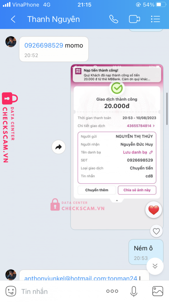 Scammer Alert: Nguyễn đức huy Reported: November 16, 2024 Scammer Information Full Name: Nguyễn đức huy Phone Number: 0926698529 Payment Gate: Momo Payment Account: 0926698529 Category: Marketplace scams Source: Checkscam Evidence Files Report Description Scam bán hotmail Comments Your comment Add Comment No comments yet. Be the first to share your experience with this scammer.