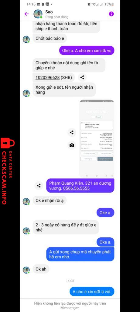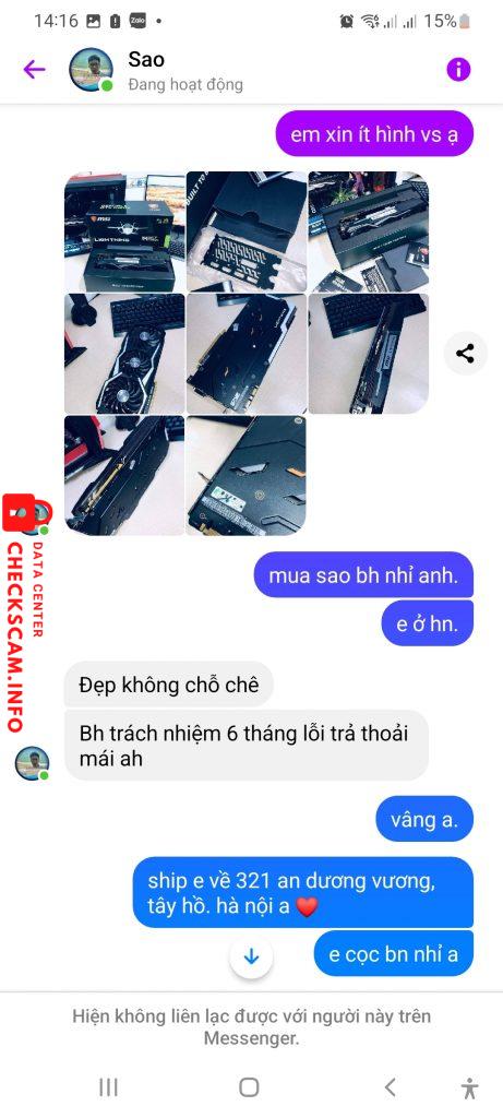 Scammer Alert: NGUYỄN ĐỨC SAO Reported: November 16, 2024 Scammer Information Full Name: NGUYỄN ĐỨC SAO Phone Number: 0342614596 Payment Gate: Shb Payment Account: 1800588856 Category: Marketplace scams Source: Checkscam Evidence Files Report Description Lừa đảo bán card 1080ti 6tr6 cọc 600k. Và block Comments Your comment Add Comment No comments yet. Be the first to share your experience with this scammer.