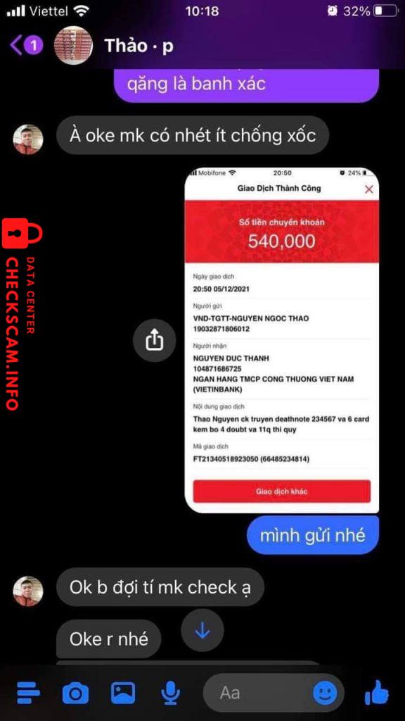 Scammer Alert: Nguyen Duc Thanh Reported: November 16, 2024 Scammer Information Full Name: Nguyen Duc Thanh Payment Gate: Viettin bank Payment Account: 104871686725 Category: Marketplace scams Source: Checkscam Evidence Files Report Description Mua truyện tranh mua bank xong không rep không seen khoá fb lun Comments Your comment Add Comment No comments yet. Be the first to share your experience with this scammer.